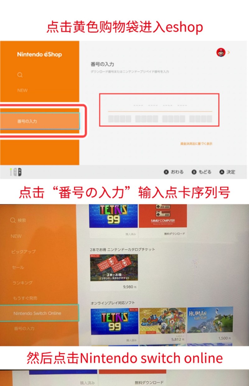 ·通过日服帐号登录eShop,选择“番号の入力”,输入代码充值。充值成功后,回到eShop首页,点击左栏的“Nintendo Switch Online”,然后找到9980日元的会员下载优惠券,点击购买即可。